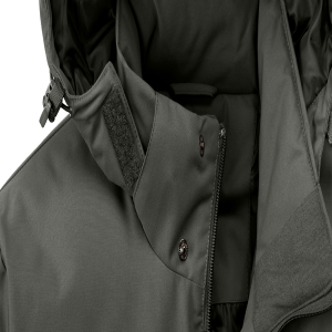 Designed for convenience, it includes a removable adjustable hood with locking drawcords, a storm flap with snap closure, and an adjustable waist for a customized fit. Hook and loop adjustable cuffs help seal in warmth.